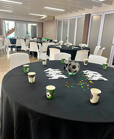 Duración 3 horas Recomendamos este combo para 4 años en adelante, los cumpleaños de 4 a 6 años, deberán ingresar a la piscina 1 adulto mínimo acompañando a los niños + los coordinadores.- Salón de eventos con capacidad para 40 personas (entre adultos y niños) Vajilla, Mobiliario y mantelería Coordinación durante todo el evento Personal de cocina y mozos Metegol – ping pong –cancha de fútbol Piscina cubierta con inflable para niños (no es exclusiva la piscina) Animación acorde a la edad acompaña a los niños a piscina