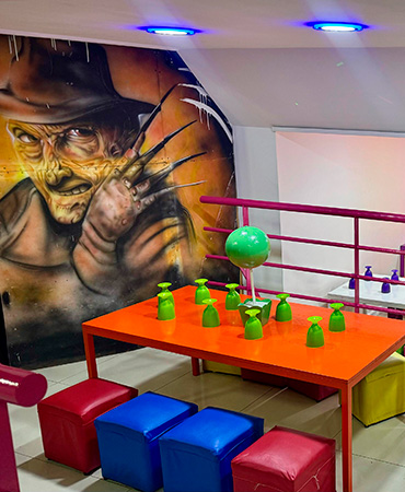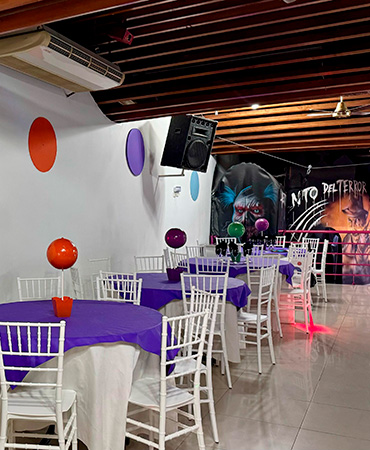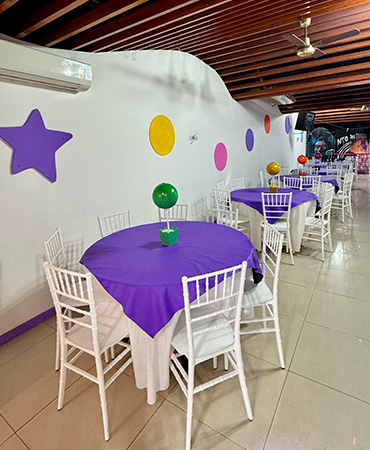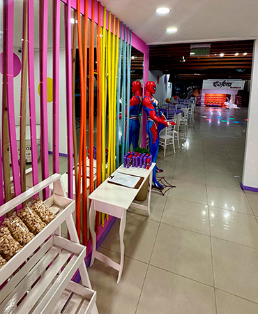 Cumpleaños Infantiles! El Servicio incluye: Invitaciones Virtuales Bolsitas y Piñata Menú Infantil: Snacks, pizzetas, panchos y gaseosa Café para los adultos Salón 1 en Planta Baja: Laberinto con varios niveles Inflable gigante con tobogán Palestra Metegol Salón 2 en Planta Alta: Laberinto con varios niveles Inflable con obstaculos Castillo del terror Metegol Plaza Blanda ¡Recordá! Consultar disponibilidad para tú evento y reservar la fecha con anticipación.