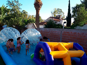 Mini parque Jummping de 6 camas elásticas. Juegos para el patio: Fútbol, fútbol tennis, juegos con animación. Personal: 1 persona en la cocina (atención mesas de adultos) y 2 animadores (animación permanente).