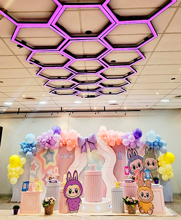 Un elegante espacio con decoración moderna, mesas y sillas cómodas, perfecto para el momento más esperado: compartir la torta y disfrutar juntos.