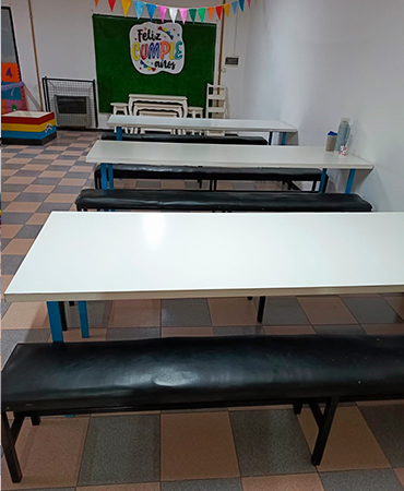 Eventos Alquiler del salón incluye: Invitaciones Virtuales Piñata con caramelos Juego de mesas para Candy Bar con Fondo Feliz Cumpleaños Mesas con bancos para los adultos Cocina equipada con Heladera, Cocina industrial de 6 hornallas, panchera, microondas, pava eléctrica. Kit de mate con yerba y azúcar Baño con cambiador de bebé Limpieza. Servicio de moza. Todos los Juegos: Laberinto Play 4 Juego de toboganes Plaza Blanda Casita de madera Autitos pata pata Canchita de fútbol Tejo Metegol Cama elástica Video Juegos arcade ¡Recordá! Consultar disponibilidad para tú evento y reservar la fecha con anticipación.