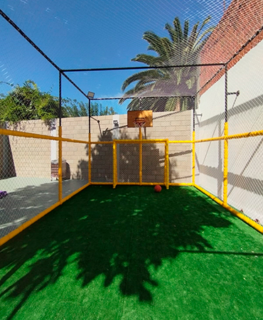 Para quienes aman el deporte, contamos con una cancha con red y césped sintético. Ideal para jugar al fútbol o al básquet con total libertad. Un espacio que combina aire libre y protección para que los chicos se diviertan a lo grande.