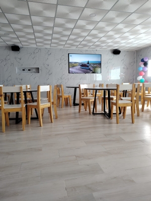 Moderno, luminoso y muy bien ambientado. Este salón cuenta con un cómodo espacio con mesas y sillas de madera, un gran televisor y paredes con detalles marmolados que aportan elegancia. Cuenta con parlantes con muy buen sonido lo cual lo hace perfecto para todo tipo de eventos nocturnos.