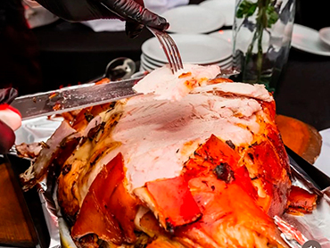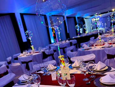 Las mesas de invitados están dispuestas con una atención meticulosa al detalle. Cada mesa cuenta con una mantelería impecable en blanco, resaltada por caminos de mesa en un elegante tonos. La vajilla de porcelana y las copas de cristal se alinean perfectamente, listos para recibir a los comensales. Los centros de mesa, consistentes en globos transparentes iluminados, le otorgan un toque moderno y festivo al ambiente. Este sector es ideal para cenas formales y eventos empresariales, pero también se adapta a cualquier tipo de celebración social gracias a su flexibilidad y buen gusto.