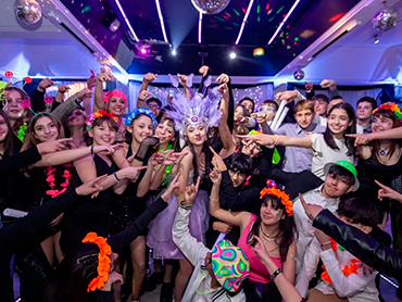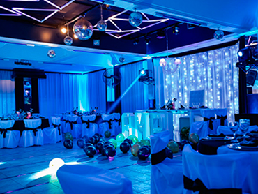 La pista de baile es el corazón vibrante de Eclipse Eventos. En las imágenes, se observa una amplia área despejada, con globos de colores que aportan un toque juvenil y alegre. Las luces colgantes geométricas, junto con las bolas de espejos y la iluminación dinámica, crean una atmósfera perfecta para bailar y disfrutar de la fiesta. Este espacio es ideal para dar inicio a las celebraciones más animadas, como los vals de bodas o fiestas de 15 años, así como para mantener a los invitados entretenidos en eventos sociales o corporativos.
