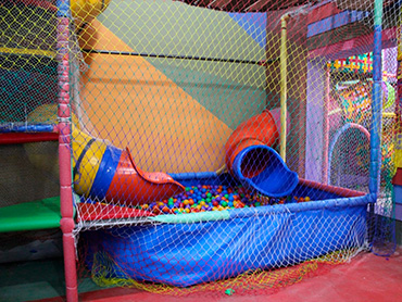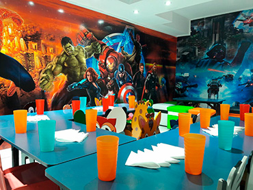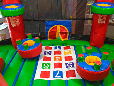 Mini parque Jummping de 6 camas elásticas. Juegos para el patio: Fútbol, fútbol tennis, juegos con animación. Personal: 1 persona en la cocina (atención mesas de adultos) y 2 animadores (animación permanente).