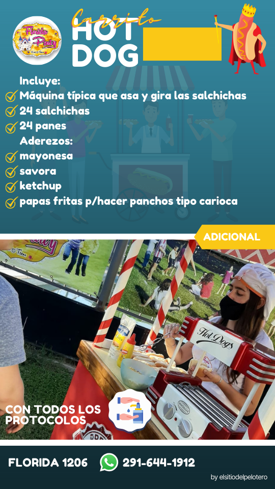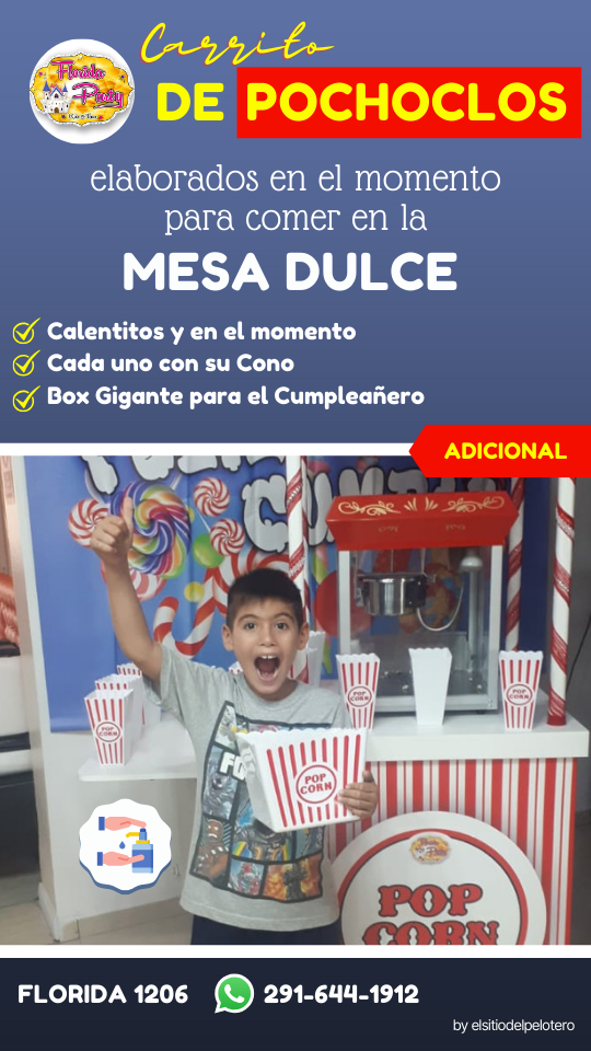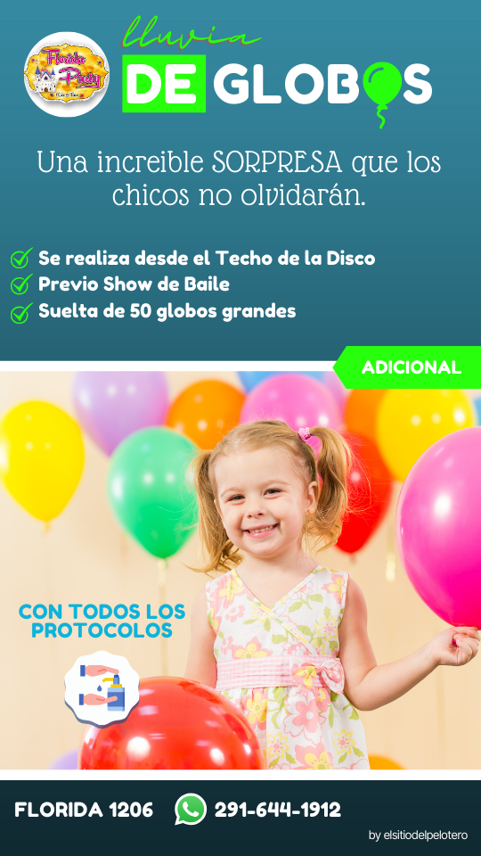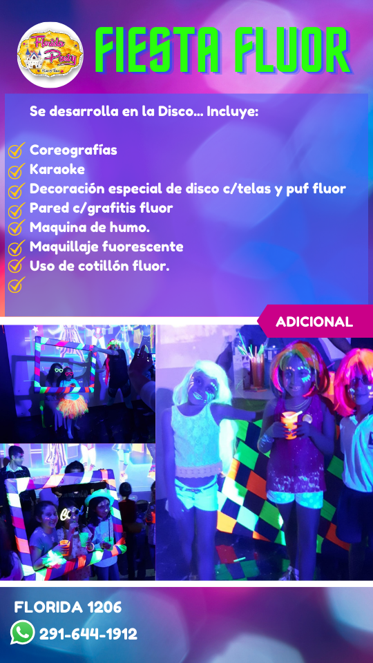 Bienvenidos a FLORIDA PARTY Ciudad de Bahía Blanca Te ofrecemos Invitaciones Virtuales e Impresas 1 persona en la cocina (hasta 15 adultos) que también atiende las mesas de los adultos. 2 animadores hasta 28 niños. En caso de superar esas cantidades se deberá contratar un adicional sea de cocina ó animación. Vajilla Incluye el uso de todos los Juegos: Disfraces de Disney Disco kids con Luces rítmicas, negras, Proyector de videos sobre pared 4 x 3 mts Máquina de Humo Plaza blanda con juegos Fisher Price para los más peques. Inflable gigante (8×5 mts) Pelotero 2 niveles conectado con túnel y puente colgante a tobogán tubular enorme.